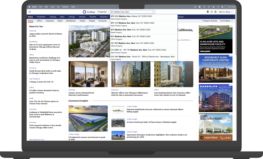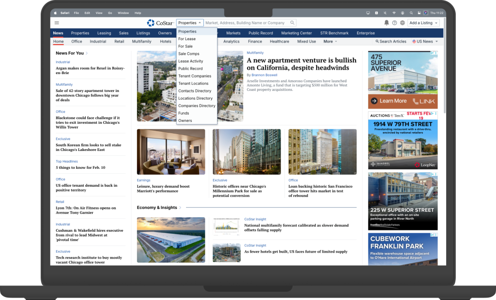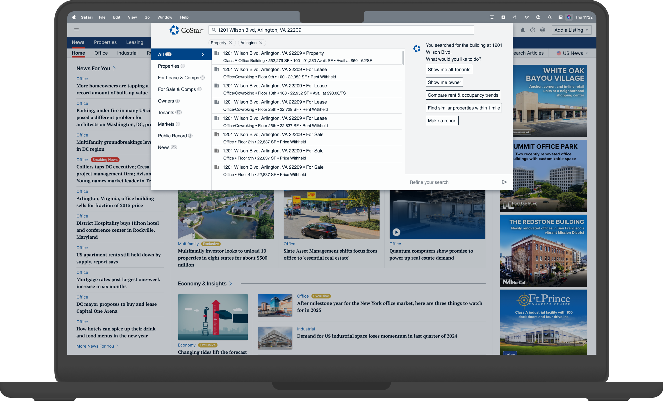 CoStar est l’outil leader du marché immobilier commercial, mais la richesse de ses données rendait la navigation complexe. L’utilisateur devait naviguer dans des silos d’informations (Propriétés, News, Comps, Locataires) sans vue d’ensemble.
