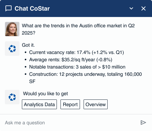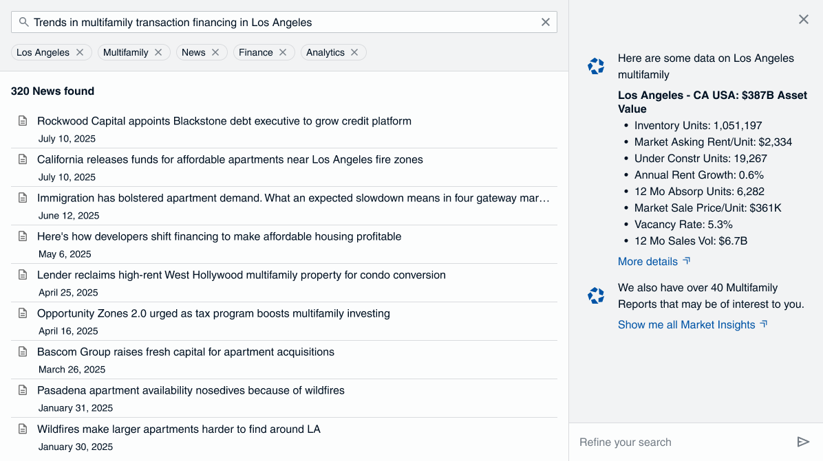Le « Plus » de la recherche unifiée : Il peut comparer instantanément deux marchés (ex: « Comparaison bureau Dallas vs Houston ») et obtenir des rapports d’analyse générés par l’IA en complément des listings.