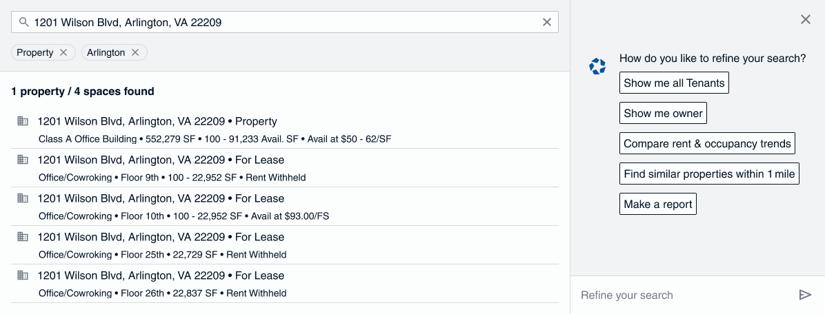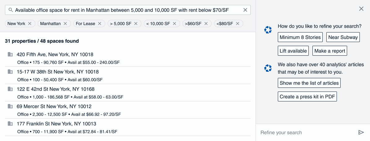 Le « Plus » de la recherche unifiée : Il peut désormais taper « Bureaux à Manhattan avec baux expirant sous 12 mois » et obtenir à la fois les propriétés, les locataires actuels et les news liées.